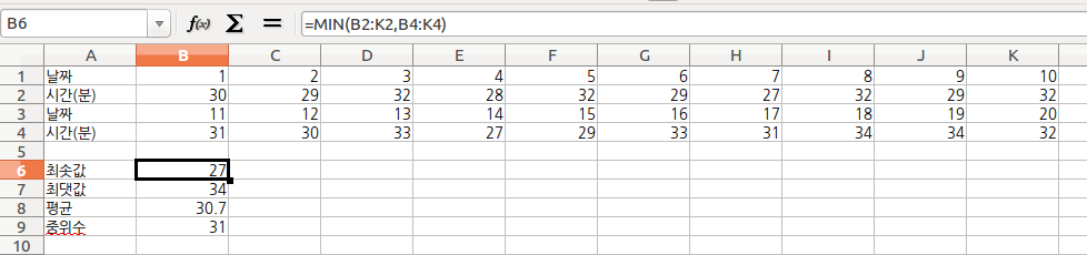 최솟값: =MIN(B2:K2,B4:K4)